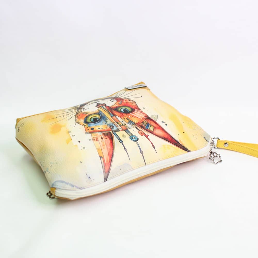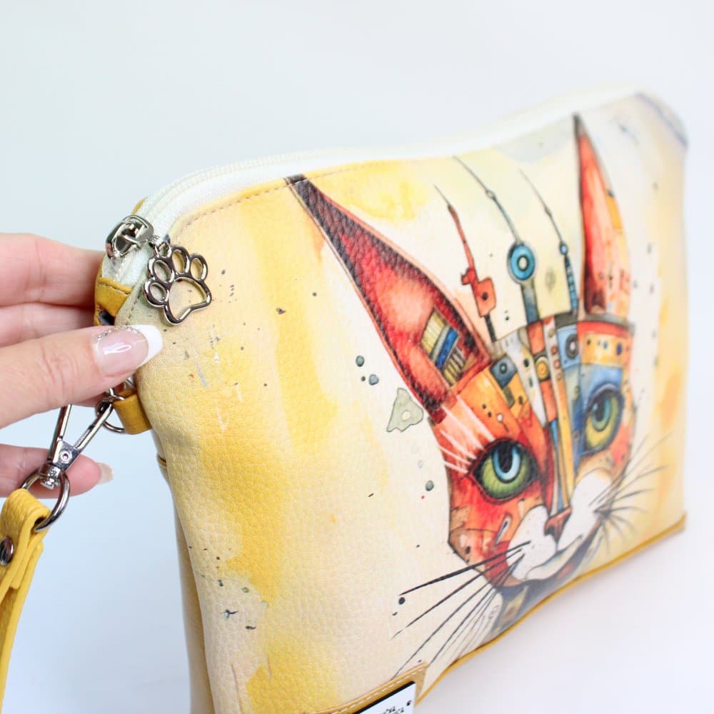 Praktična in velika toaletna torbica, ki združuje funkcionalnost in umetniški pridih. Spredaj jo krasi barvit motiv mačke, ki bo zagotovo izstopal, kamorkoli jo vzamete.
